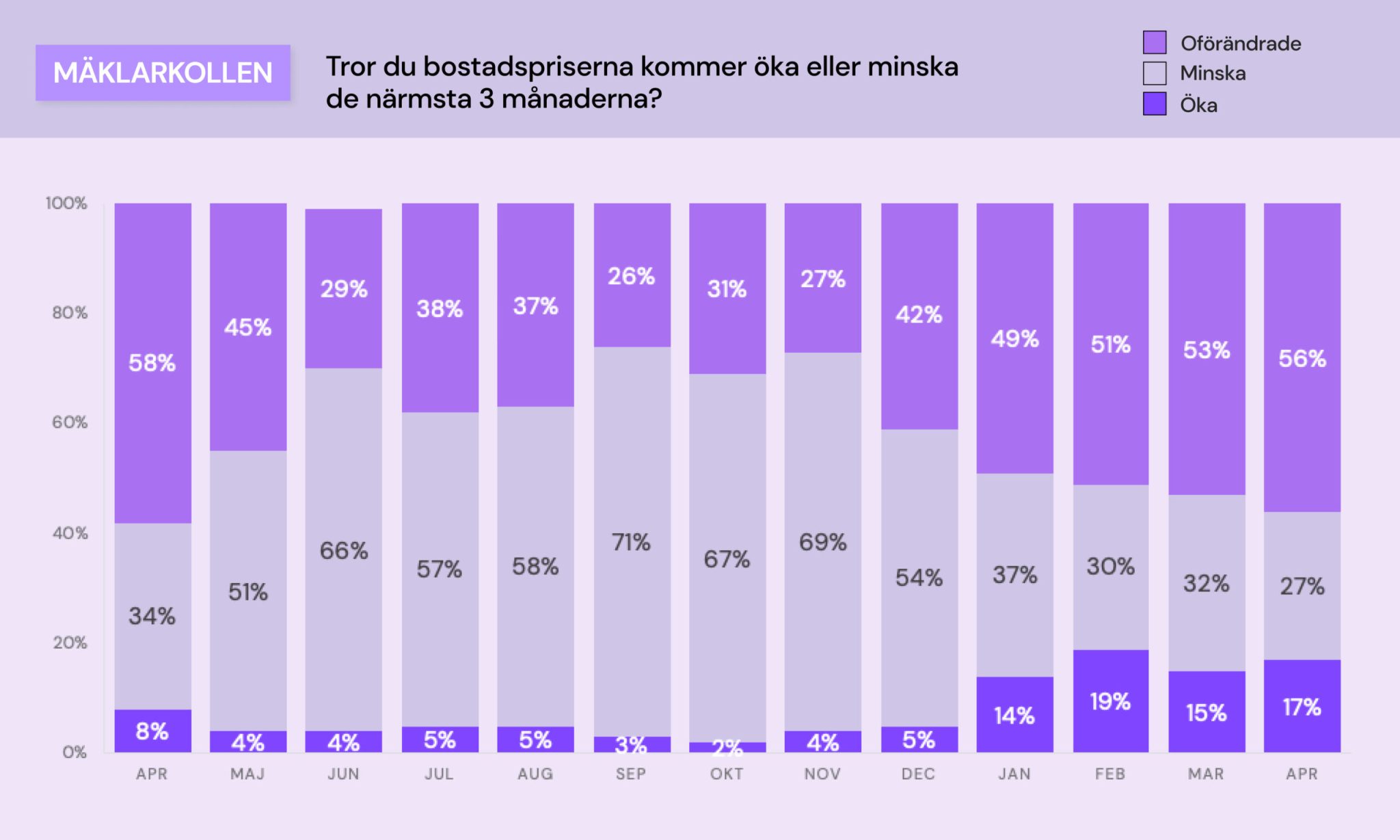 Enligt Boneos undersökning är majoriteten av mäklarna positiva till bostadsmarknaden och tror på stigande bostadspriser, där 17 procent tror på en ökning de kommande tre månaderna. Endast 27 procent av mäklarna spår minskade priser, vilket är den lägsta andelen sedan mars 2022 då endast 15 procent av mäklarna hade samma förutsägelser.