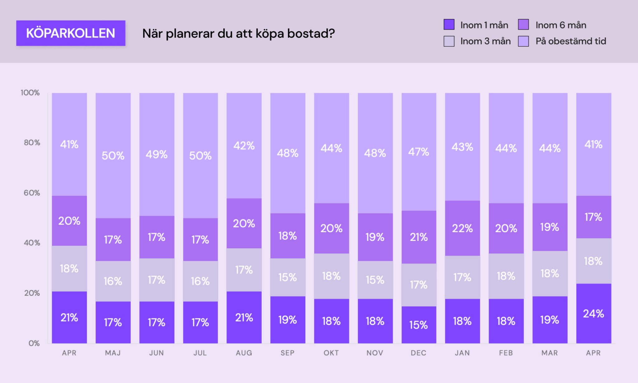 Köparkollen för april visar också att köpbenägenheten hos Boneos besökare är den högsta på 12 månader. 59 procent av de tillfrågade planerar att köpa bostad inom ett halvår, vilket ligger på samma nivå som i april 2022. Dessutom siktar nästan var fjärde köpare, 24 procent, på att köpa bostad redan inom den närmsta månaden vilket är rekord sedan mätningarna i Mäklarkollen & Köparkollen startade.