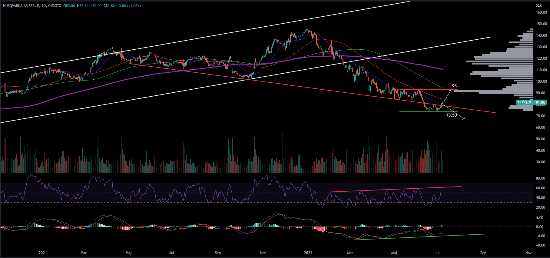 Husqvarna publicerar kvartalsrapport under veckan (15 juli), marknaden känner till att Husqvarnas resultat och omsättning har påverkats negativt av rådande komponentbrist under det andra kvartalet. Denna information kommunicerades under juni i samband med en vinstvarning. Om vi skiftar fokus till den tekniska biten så ser den enligt mig inte ut att locka så mycket. Under 2020 – 2021 befann sig aktiekursen i en stabilt stigande trendkanal, till slut bröt aktiekursen söderut och sedan dess har lägre toppar följts av djupare bottnar, samtidigt som aktien befinner sig under de längre glidande medelvärdena.