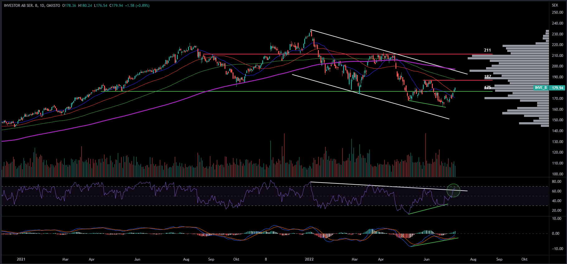 Å andra sidan kan vi se att aktiekursen vaknat till liv lite under de senaste veckorna. Årets lägsta notering sattes kring 163 SEK och sedan dess är aktiekursen upp lite mer än 11 procent. Den senaste rörelsen på uppsidan innebär att det tidigare motståndet vid 175 SEK har tagits ut och därmed är tolkningen att denna nivå skall agera som ett stöd härifrån och framåt tills aktiekursen handlas under nivån igen. Dessutom har aktiekursen även tagit sig över de kortsiktiga glidande medelvärdena (MA 20 och 50). Möjligtvis skall aktiekursen stiga upp till trendens tak, på uppsidan finns dock ett större horisontellt motstånd som varit i spel tidigare under året. 187 SEK är nästa motståndsnivå på ovansidan, om nivån tas ut tror jag det finns ökad chans för att aktiekursen skall handlas upp till taket av trendkanalen. Om säljarna däremot står starka kring dessa nivåer så tror jag en ny lägre notering blir mer aktuell. Momentumindikatorerna har vaknat till liv och RSI noterar värden som vi senaste såg i mars tidigare i år. MACD har även stigit kraftigt och ser ut att utmana nollnivån inom kort. Sammanfattningsvis så är det intressant att se hur aktien agerar i ett scenario där 187 SEK utmanas. Jag tror att den reaktionen kommer att ge en bra guide för hur aktien skall handlas i det kortare perspektivet.
