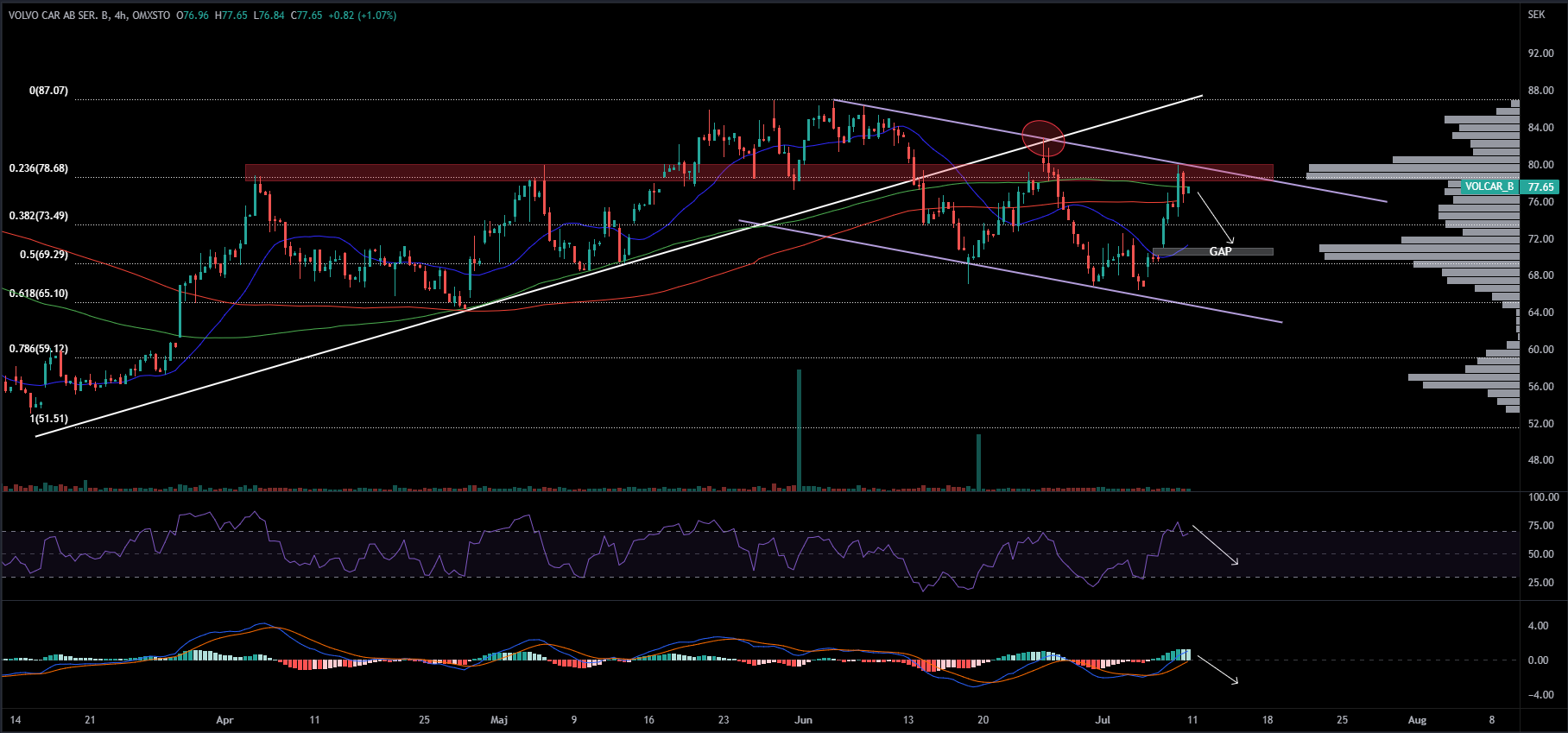 Volvo Car har rekylerat inom ramen för en fallande trend. Under 5e juli sattes en ny lägre notering (66 SEK) och sedan dess har aktiekursen stigit kraftigt för att under fredagens handel sätta en ny lägre topp kring 80 SEK. Uppgången under veckan innebar en rörelse på drygt 20 procent som mest. Under Fredagens eftermiddag vände dock aktiekursen ned och vi kan nu tydligt rita ut en fallande trendkanal och min syn på kort sikt är att aktiekursen skall komma ner i den rådande trendkanalen. Denna vy bygger på att aktiekursen befinner sig nära trendtaket samtidigt som RSI fallit under 70-nivån vilket indikerar fallande momentum för tillfället. Utöver detta kan vi även se att VRVP (Volymhyllan) talar för att nästa stora stöd på nedsidan befinner sig kring gapet som formades under föregående veckan. Detta talar för att gapet ska täppas till, gapet sträcker sig från från cirka 71-70 SEK. Om denna nivå eventuellt nås kommer R/R på uppsidan stärkas, dock skall aktien handlas hela vägen ned till trendgolvet om den skall fortsätta det senaste handelsmönstret.