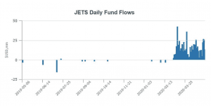 Under det senaste året, innan utbrottet av Coronaviruset såg denna fond nettoinflöden under en enda dag. Nu har de stigit med mer än 600 MUSD. Bland fondens innehav finns aktier i Southwest AirlinesAmerican AirlinesDelta Air Lines och United Airlines. Dessa flygbolag utgör 11.4%, 11.0%, 9.4% och 9.1% av fondens förmögenhet.
