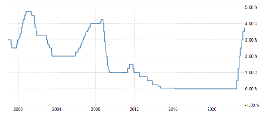 Europeiska centralbankens ränta senaste 25 åren. Räntehöjningstakten det senaste året har varit rekordsnabb från rekordlåga nivåer.