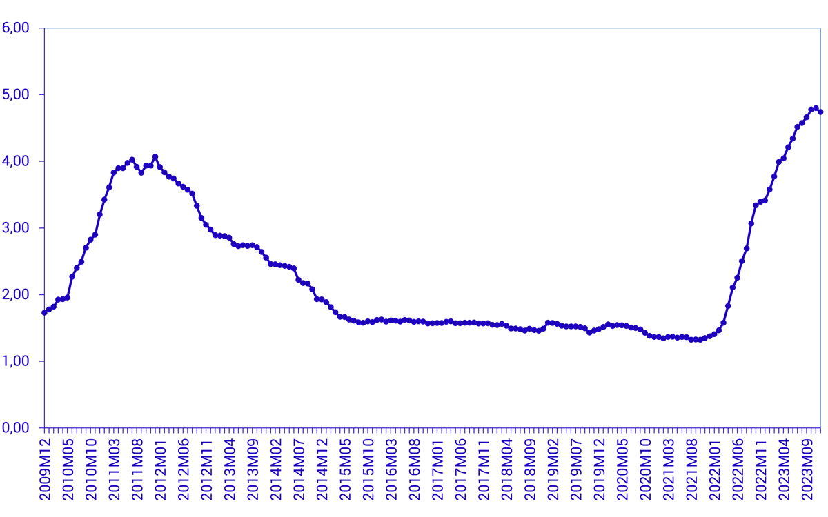 Snittränta för nya bolåneavtal i procent, december 2009 – december 2023