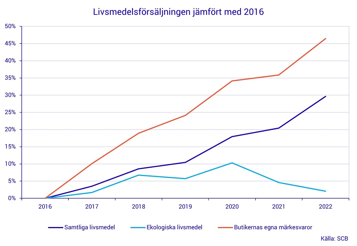 ”Egna märkesvarors popularitet har vuxit enormt. Från 2016 till 2022 ökade dessa varor i försäljning 22 gånger mer än ekologiska produkter”, säger Nilsson.