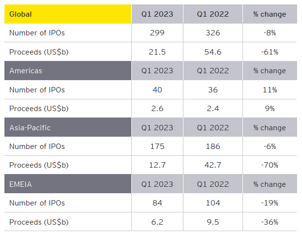 Börsnoteringarna fortsätter att visa en negativ trend under årets första kvartal. Enligt en rapport från rådgivnings- och revisionsföretaget EY har antalet börsintroduktioner minskat med 8 procent jämfört med samma period förra året. Samtidigt har transaktionsintäkterna minskat med hela 61 procent. Detta beror på flera faktorer, bland annat räntehöjningar, sval aktiemarknad, inflation och en turbulent banksektor.