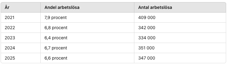 Under 2024 bedöms arbetslösheten öka till ett årsgenomsnitt på 351 000 personer för att under 2025 minska till 347 000.