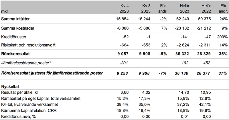 Under det fjärde kvartalet 2023 minskade rörelseresultatet jämfört med det tredje kvartalet till 9 057 miljoner kronor från 9 908 miljoner kronor. Räntabiliteten på eget kapital och K/I-talet var 15,2 % respektive 38,4%, vilket visar på en stabil prestation trots en nedgång från tidigare kvartal. Kreditförlustnivån låg kvar på 0,00 %.