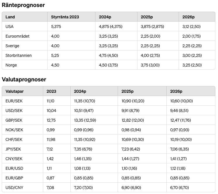 I USA är konjunkturen fortsatt stark, till skillnad från Sverige och euroområdet, samtidigt har inflationsnedgången stannat av vilket fått Federal Reserve att skjuta på den första räntesänkningen. Men bankens ekonomer räknar med att tillväxten och inflationstrycket avtar och att Fed sänker i september. I Euroområdet har konjunkturen svalnat men arbetsmarknaden är fortsatt stram. Inflationen är på väg ner och ECB lär sänka räntan i juni, vilket bidrar till högre tillväxt nästa år. I Sverige fortsätter inflationen ner, både konjunktur och arbetsmarknad har svalnat och Riksbanken har redan inlett räntesänkningar. Prognosen är att räntan sänks ytterligare i september och i december i år.