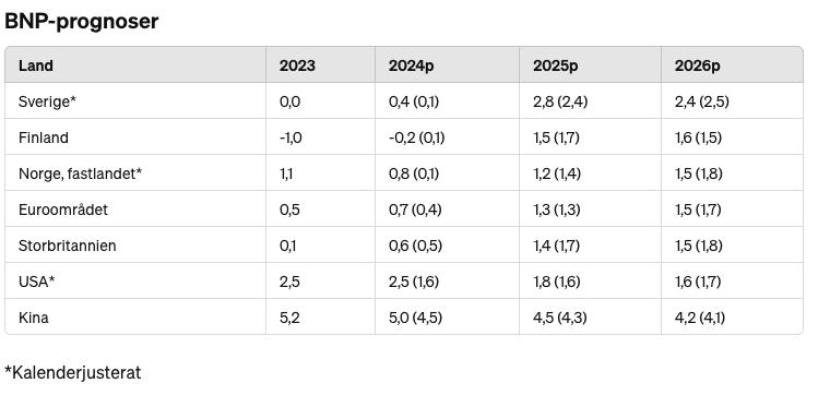 Handelsbankens ekonomer räknar med att BNP ökar med 0,4 procent i år, för att därefter stiga med 2,8 procent nästa år och 2,4 procent 2026. Tillväxten 2025 och 2026 är starkare än i de flesta andra europeiska länder. En mer expansiv finanspolitik i Sverige och att svensk ekonomi är mer räntekänslig, bidrar till att återhämtningen blir starkare när räntorna sänks. Framförallt handlar det om en stark återhämtning för hushållens konsumtion men även offentliga investeringar och offentlig konsumtion ökar starkt.