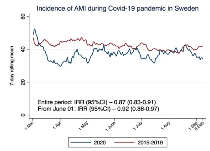 3.Det går inte att utesluta att social distansering, lugnare hemmaliv och mindre stress kan ha bidragit till ett minskat insjuknande i hjärtinfarkt och annan hjärt-kärlsjukdom.