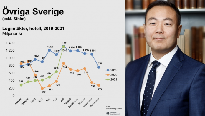 Det innebär sammantaget att logiintäkterna för samtliga svenska hotell i juli skrivs till 1 655 miljoner kronor. Det ska jämföras med 1 917 miljoner i juli 2019 och 1 009 miljoner i juli 2020.