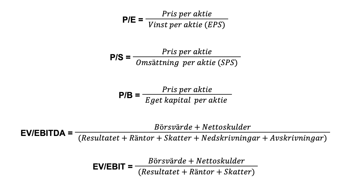 Det finns en uppsjö av olika nyckeltal och multiplar som kan vara användbara beroende på vilket bolag som man väljer att analysera. Vanligt förekommande nyckeltal är P/E, P/S, P/B, EV/EBIT och EV/EBITDA. Kalkylerna för samtliga multiplar presenteras nedan: