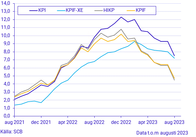 Enligt SCB:s senaste rapport idag, var inflationstakten enligt Konsumentprisindex (KPI) 7,5 procent i augusti 2023. Detta representerar en nedgång från den föregående månaden, juli, då inflationen mättes till 9,3 procent. Månadsförändringen från juli till augusti var en ökning på endast 0,1 procent enligt KPI. Samtidigt visade KPIF (Konsumentprisindex med fast ränta) en inflationstakt på 4,7 procent i augusti.