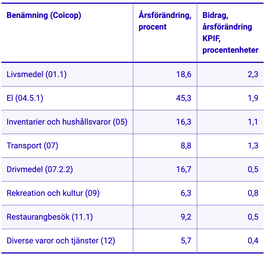 Störst prisökning bidrog elpriserna med som under det gångna året steg med 45,3 procent. Inflationstakten påverkades även av en bred skara inom livsmedel. De främsta bidragen kom från mjölk, ost, ägg, kött samt bröd med övriga spannmålsprodukter. Prisökningar noterades även inom inventarier och hushållsutrustning, restauranger, rekreation och kultur samt varor och tjänster.