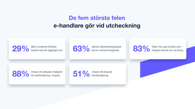 • Nittiofem procent av de ledande e-handelssidorna gör fem eller fler grundläggande fel i sina utcheckningar.