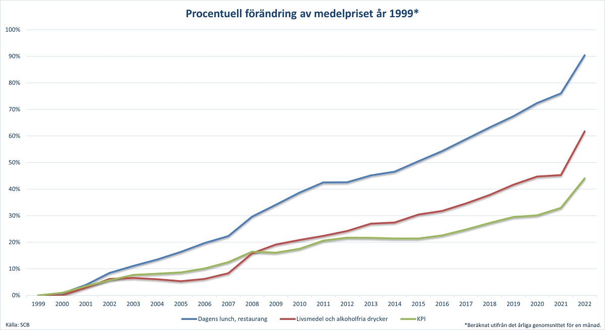 – Om vi utgår från de genomsnittliga priserna varje år så steg priset på en dagens lunch med 90 procent mellan 1999 och 2022. Under samma period steg priset på livsmedel och alkoholfria drycker med 62 procent.