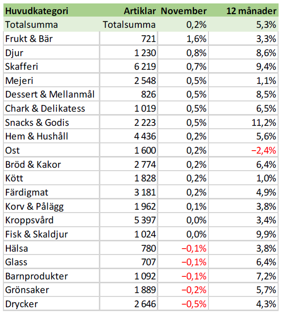 I november steg priserna på över 43 000 dagligvaror med 0,2 %, vid en jämförelse mellan priset den 1 december och priset den 1 november. Av dessa produkter ökade priset på 23 %, medan priset på 14 % av produkterna sjönk och 63 % av produkterna förblev oförändrade.