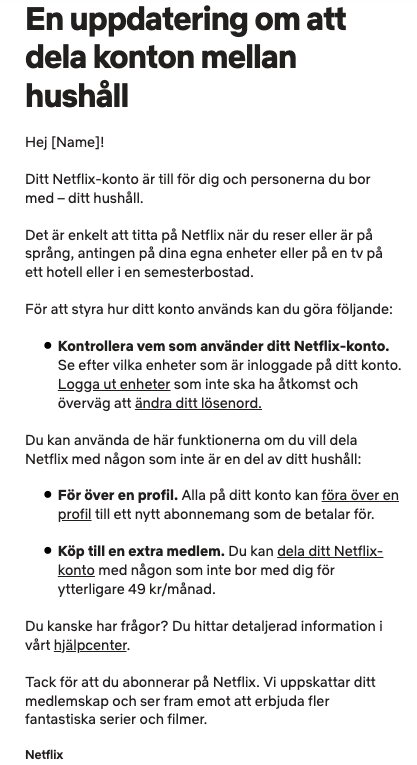 “Med start i dag kommer vi att börja skicka ut det här e-postmeddelandet till medlemmar som delar Netflix utanför sitt hushåll i Sverige”, skriver Netflix i ett pressmeddelande på onsdagen.