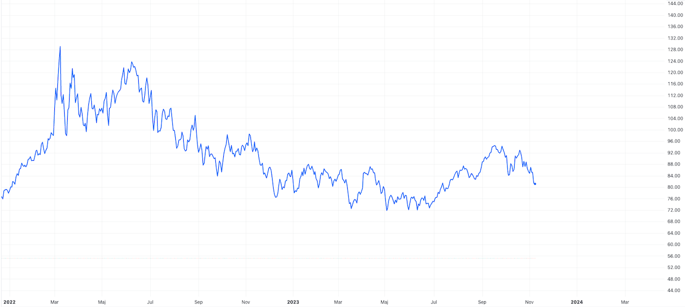 Under den senaste tiden har oljepriset sjunkit och noterar under onsdagsförmiddagen den lägsta noteringen sedan 24 juli i år.
