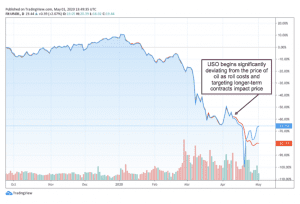 I april gav USO en 100 procentig exponering för det terminskontrakt på WTI som förföll i maj 2020. Det är det kontrakt som kort sjönk till – 40 dollar per fat. Fonden tog allvarliga förluster och behövde göra en omvänd split med villkoren 1: 8 för att bara hålla sig flytande.