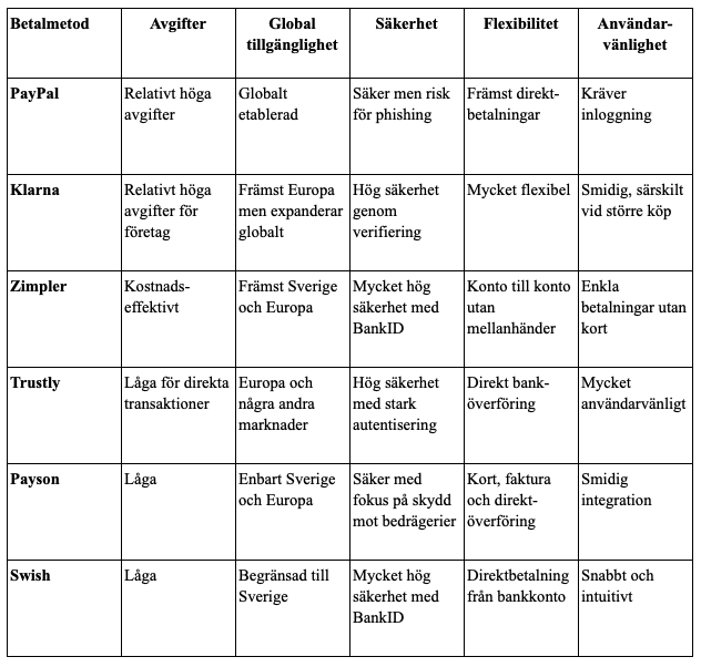 Vi kommer kort att gå igenom olika svenska betalningslösningar nedan, men inleder här med en jämförande tabell för översiktens skull.