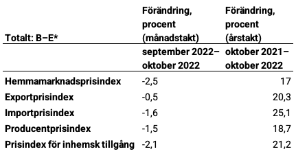 Producentprisindex (PPI) gick ner med 1,5 procent i oktober jämfört med september 2022. På exportmarknaden sjönk priserna med 0,5 procent och på hemmamarknaden sjönk de med 2,5 procent. På importmarknaden sjönk priserna med 1,6 procent. Jämfört med oktober 2021 ökade producentprisindex med 18,7 procent (20,6 procent i september).