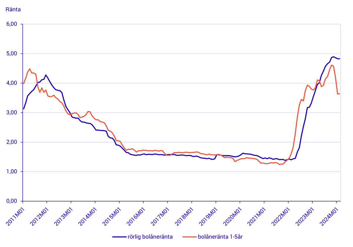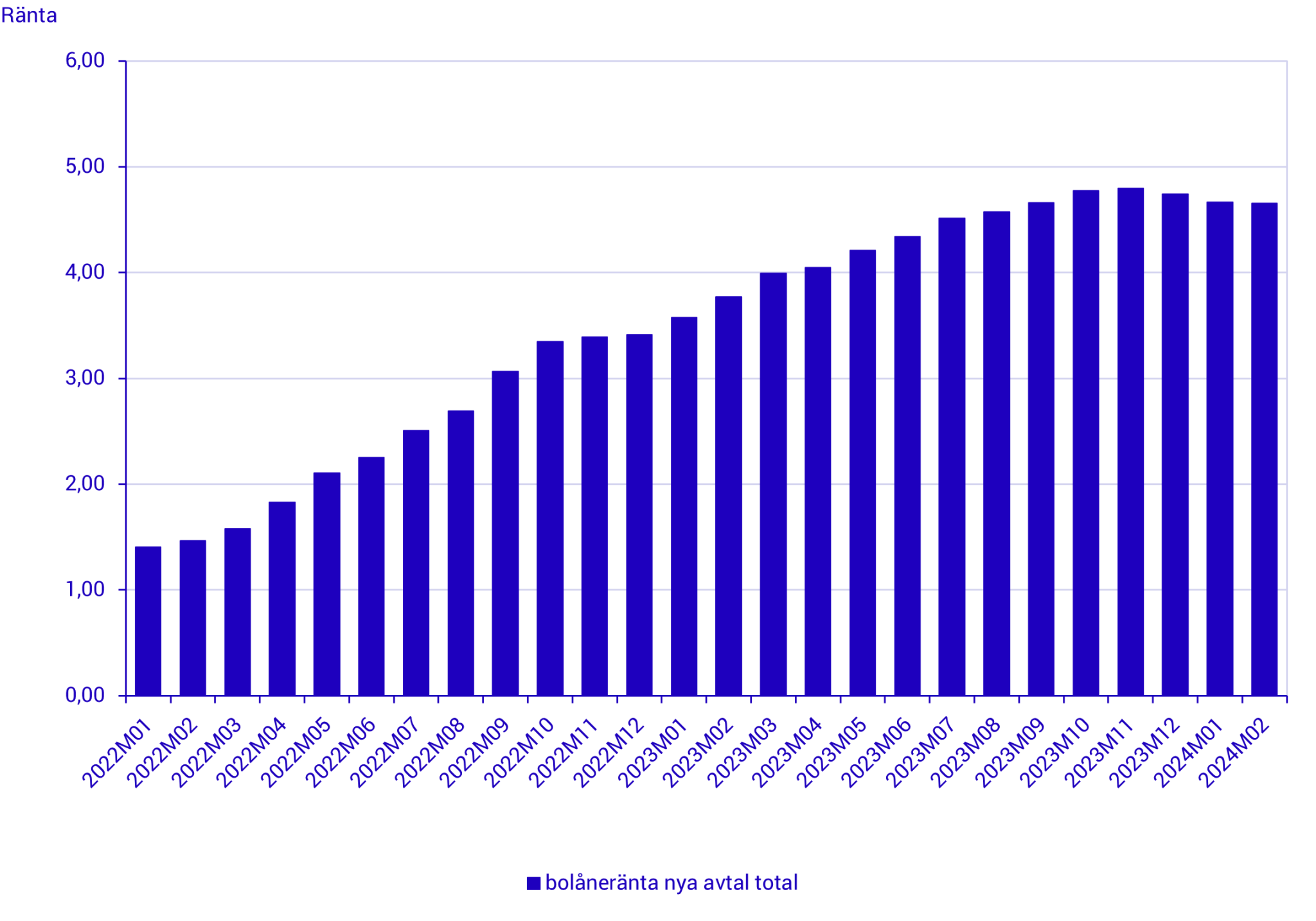 Specifikt har räntor för nya bolåneavtal med räntebindningstider på 1 till 5 år sjunkit från 4,19 procent i december 2023 till 3,63 procent i januari, för att sedan öka svagt till 3,64 procent i februari. Räntan för rörliga bolån förblev oförändrad från januari till februari, stabil på 4,83 procent.