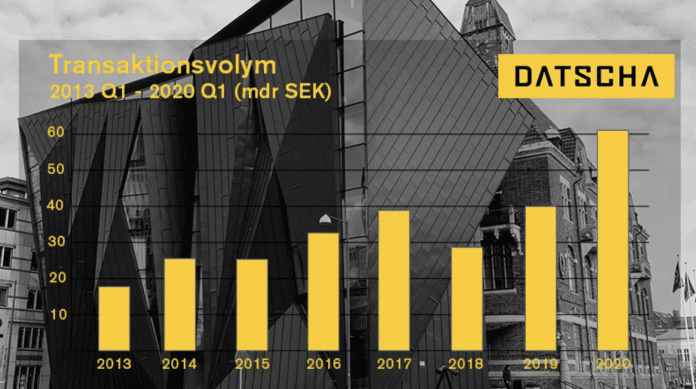 Efter rekordåret 2019, då det genomfördes kommersiella fastighetsaffärer för 226 miljarder kronor accelererade marknaden in i 2020. Redan under första kvartalet uppgick transaktionsvolymen till 62 miljarder kronor. Det motsvarar en ökning med 55 procent jämfört med motsvarande period 2019 och utgör den högsta nivån sedan finanskrisen 2008 visar statistik i ett pressmeddelande från analysföretaget Datscha AB.