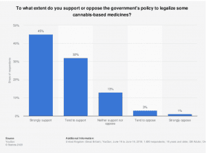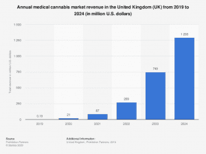 In 2018 medical cannabis products were legalised for the first time in the United Kingdom. Subsequent to this legalisation, the country’s medical cannabis market is forecasted to increase in size massively. In 2019, the revenue of the medicinal cannabis market in the UK was less than 200 thousand U.S. dollars, by 2024 this revenue is expected to be approximately 1.3 billion U.S dollars.