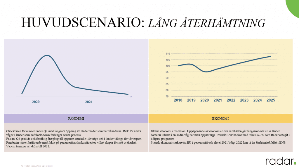 - Svensk BNP-utveckling med -6% till -7% nedgång (bättre än EU i genomsnitt).