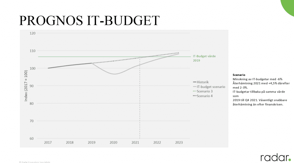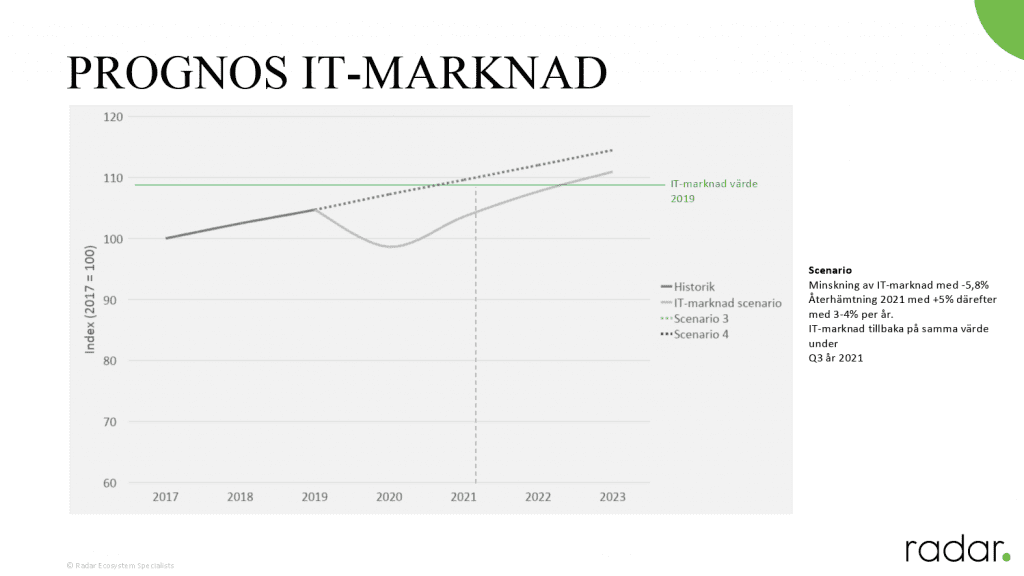 Nu kommer det första utkastet av den första analysen om pandemins påverkan på IT-sektorn i Sverige. Finanstid har fått ta del av den prognos från Radar som kan komma att uppdateras i september med hänsyn till stora svängningar i utfall.