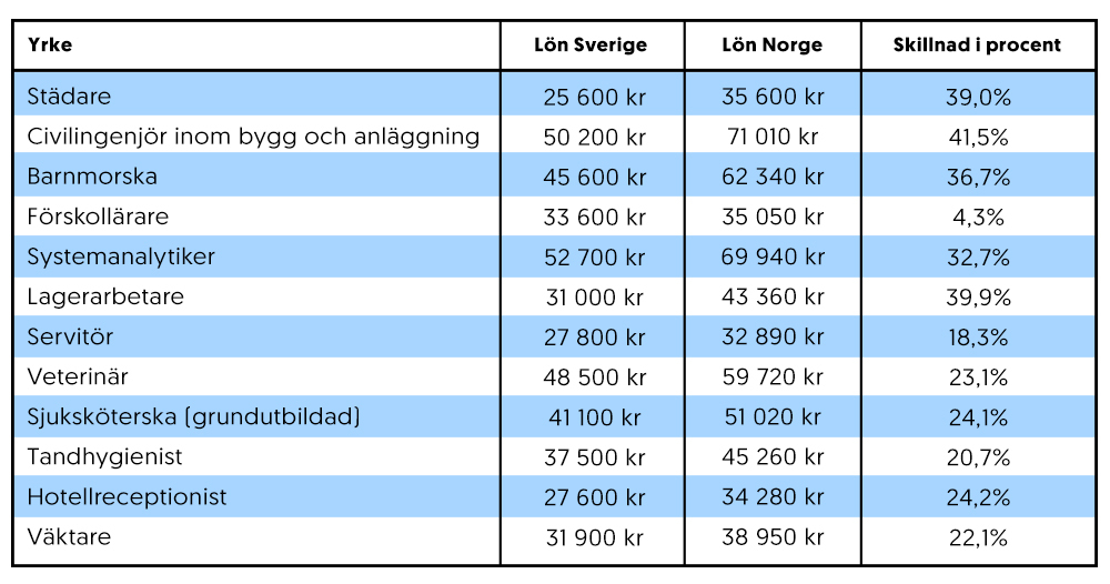 De stora löneskillnaderna varierar naturligtvis beroende på olika yrken. I vissa fall kan lönerna vara så mycket som 40 procent högre i Norge jämfört med Sverige, medan skillnaderna inom andra yrken inte är mer än några procent.