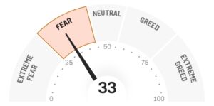 Kikar vi på CNN’s Fear & Greed Index som förra veckan touchade Extreme Fear-nivån på 25, har nu stigit något till Mid Fear-nivå på 33. Detta kan till stor del härledas till räddningsaktionen av Credit Suisse och med dess signaler om att världens centralbanker kommer göra allt i sin makt för att stävja spridningsrisken.