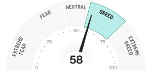 Tar även veckotempen på CNN’s omtalade Fear & Greed Index som under de senaste två veckorna backat från Extreme Greed till att börja närma sig ett mer neutralt läge. För en vecka sedan låg mätningen på 69 mot nu 58. Detta är en tydlig signal på att FOMO-känslan på börsen lagt sig till en mer försiktig hållning.