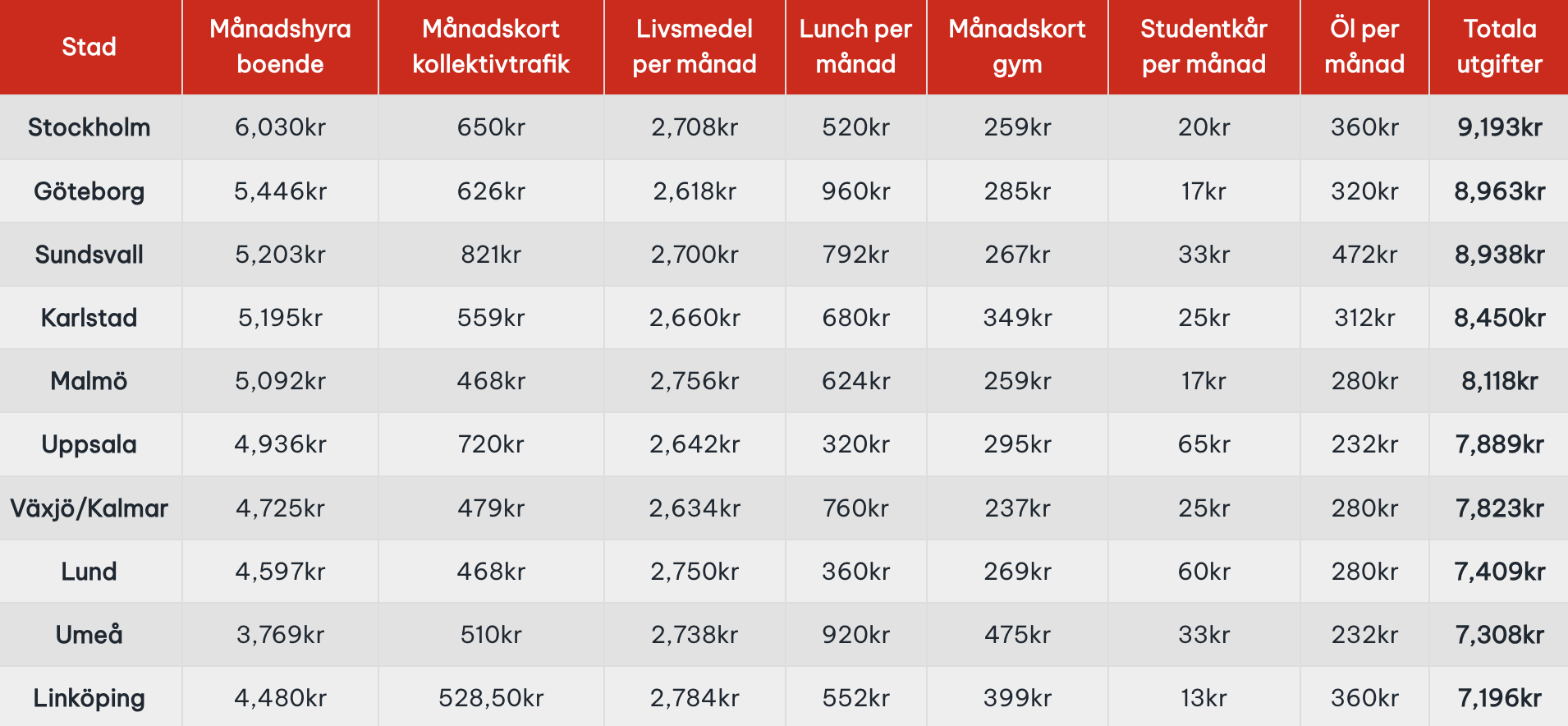 Enligt Samblas uträkning är det alltså i Linköping som studenterna kan leva allra billigast, med totala utgifter på knappt 7 200 kronor i månaden. Tätt efter följer Umeå och sedan Lund, där man kan räkna med utgifter under 8 000 i månaden. Detta kan jämföras med Stockholm där en student kan räkna med att spendera närmare 9 200 kronor månadsvis.