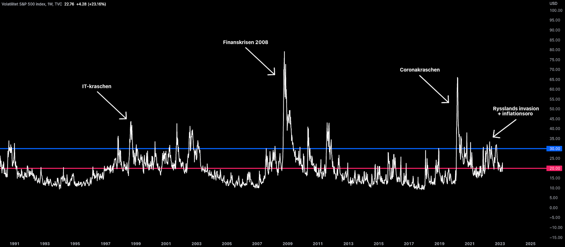 Generellt sett anses värden över 30 signalera ökad volatilitet från ökad osäkerhet, risk och investeraroro. Värden under 20 motsvarar vanligtvis mer stabila, mindre stressiga perioder på marknaderna.