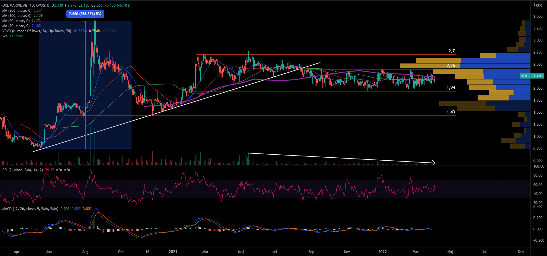 Aktien har rört sig sidledes samtidigt som volymen har minskat, senaste årets prisrörelse kan tolkas som en volatilitetskontraktion där volatiliteten har minskat parallellt med handelsvolymen. I ett sådant handelsmönster kan det ske försök till utbrott, det vill säga att en signifikant prisnivå tas ut vilket inte allt för sällan leder till kraftiga kursrörelser kortsiktigt. Om man tar upp Bollinger Bands-indikatorn kan man se att OXE Marine har gått från ett hög volatilitetsläge till ett allt mer låg volatilitetsläge. Distansen till två standardavvikelser har alltså blivit betydligt kortare. Detta har även resulterat i att samtliga glidande medelvärdena har samlats och befinner sig i dagsläget kring samma prisnivåer. Det kan vara en potentiell uppladdning som sker nu och det kan vara intressant att bevaka kommande kursrörelser. Dock ska man känna till att sådana konsolideringar kan sträcka sig under betydligt längre tid. Det som jag personligen tycker är intressant är att OXE Marine upplevde en kraftig rörelse som motsvarade en uppgång på cirka 350 % under 2020, vid sådana uppgångar brukar priset röra sig tillbaka med tiden, men i detta fall så står sig aktien stabilt över fib 0,5. Det tycker jag är ett styrketecken i sig och ger indikationer på att det finns ett underliggande köptryck trots rörelsen i sidled.