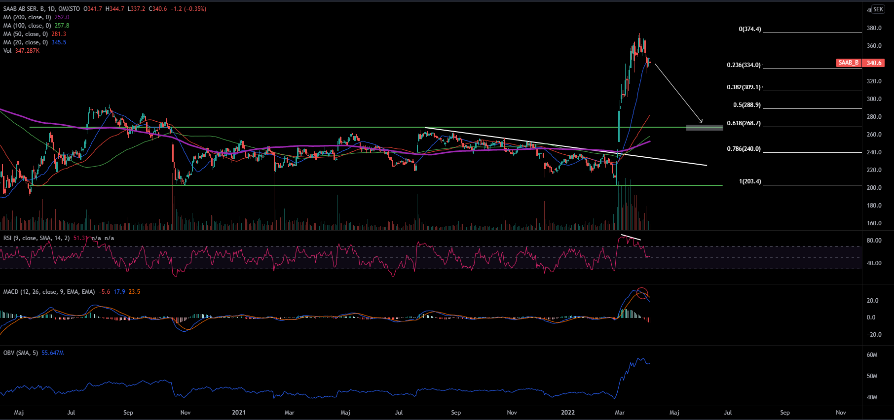 Framåt är det väldigt svårt att veta hur aktiekursen kommer att utvecklas, rent tekniskt ska den ner mot fib 0,5 alternativt 0,618 där taket för den föregående rangen befinner sig. Dock kommer krigets utveckling att ha en signifikant påverkan på aktiekursen, om det exempelvis skulle eskalera så kan nog SAAB fortsätta segla uppåt även fast den tekniska biten ser svag ut.