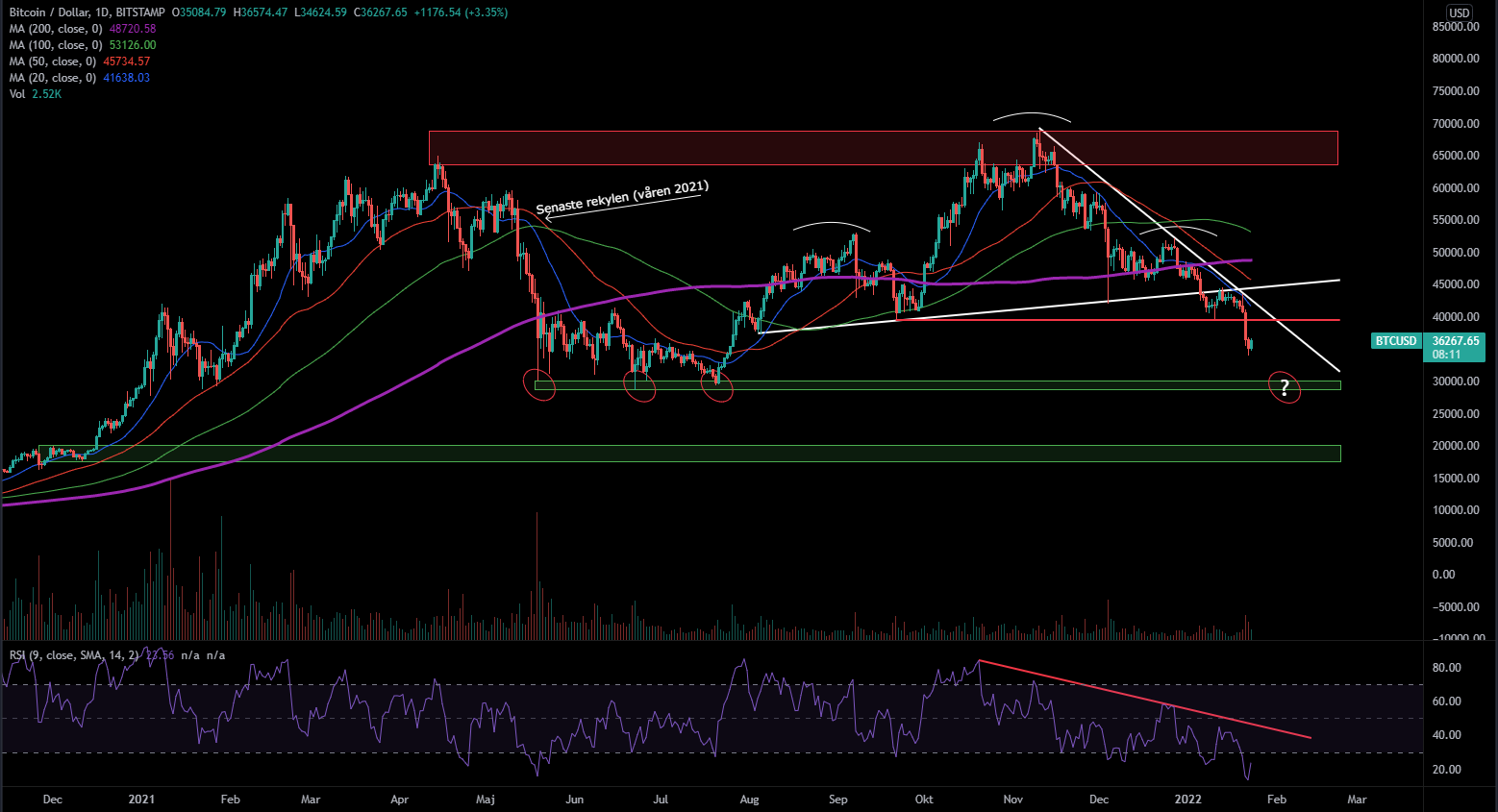 Den här kursnedgången har inneburit att samtliga glidande medelvärden noteras ovanför Bitcoin. Såklart ett negativt utseende samtidigt som jag tycker mig se en “Huvudskuldra-formation som nyligen har bekräftats. För den som vill gå lång Bitcoin så är det viktigt att volymen avtar successivt samtidigt som volatiliteten minskar. Det hade varit positivt om Bitcoin orkar röra sig sidledes runt 30 000 USD eller strax ovanför, det hade i alla fall jag sett som en tydlig indikation på att köparna börjar komma tillbaka vilket är extra viktigt vid kritiska prisnivåer.