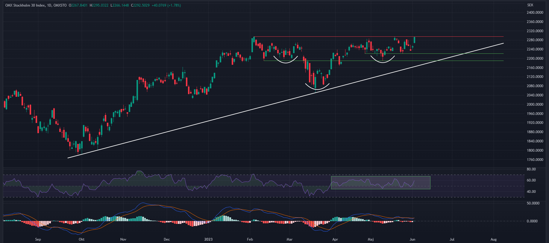 Framåt ur ett kortsiktigt perspektiv ser OMXS30 relativt pigg ut. Det är ett styrketecken i sig att årets högsta nivåer utmanas med korta mellanrum. Samtidigt har köparna försvarat viktiga nivåer på nedsidan och varit duktiga på att komma tillbaka vid högre nivåer vilket resulterat i att den stigande trenden håller sig intakt. Sedan början av februari ser det ut som att OMXS30 har byggt upp en inverterad huvudskuldra-formation, en prisformation med positiv underton. Nacklinjen i det här fallet befinner sig vid 2995, och om vi ser en dagsstängning ovanför nacklinjen ökar sannolikheten för att priset ska fortsätta röra sig uppåt.