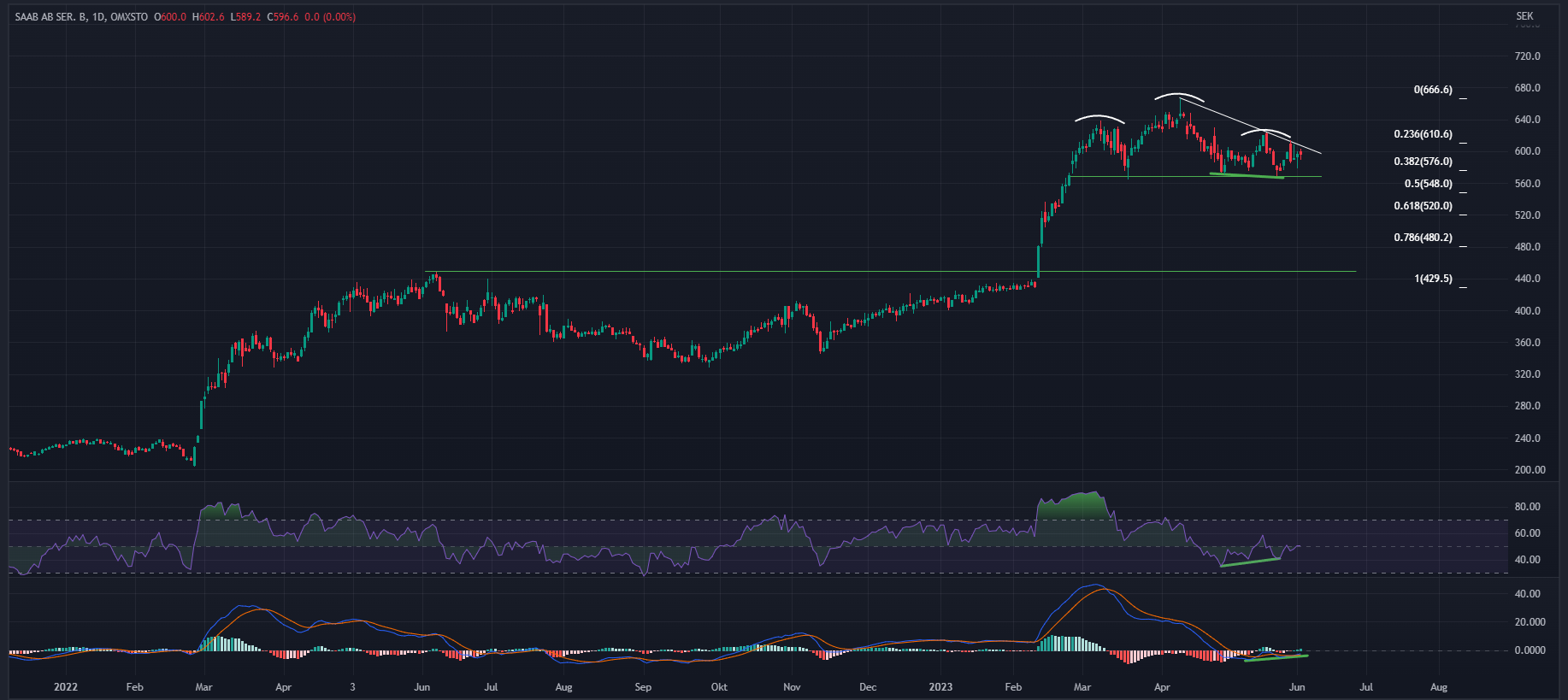 Rent tekniskt befinner sig SAAB i en stigande trend där högre toppar följs upp av högre bottnar. I denna analys vill jag dock flagga för en potentiell toppformation. Sedan februari i år har nämligen en huvudskuldra-formation byggts där den högra skuldran nu är under konstruktion. Detta betyder nödvändigtvis inte att aktien ska bryta nacklinjen för att genomföra en djupare rekyl. Man ska inte stirra sig blind på prisformationen för det kan mycket väl vara så att aktiekursen vill studsa vidare. Men det är ändå viktigt att hålla koll på nacklinjen eftersom en stängning under prisnivån bekräftar den negativa prisformationen. Med andra ord, en dagsstängning under 567 alternativt 563 (lägsta noteringen sedan prisformationen började byggas) för att vara på den säkra sidan.