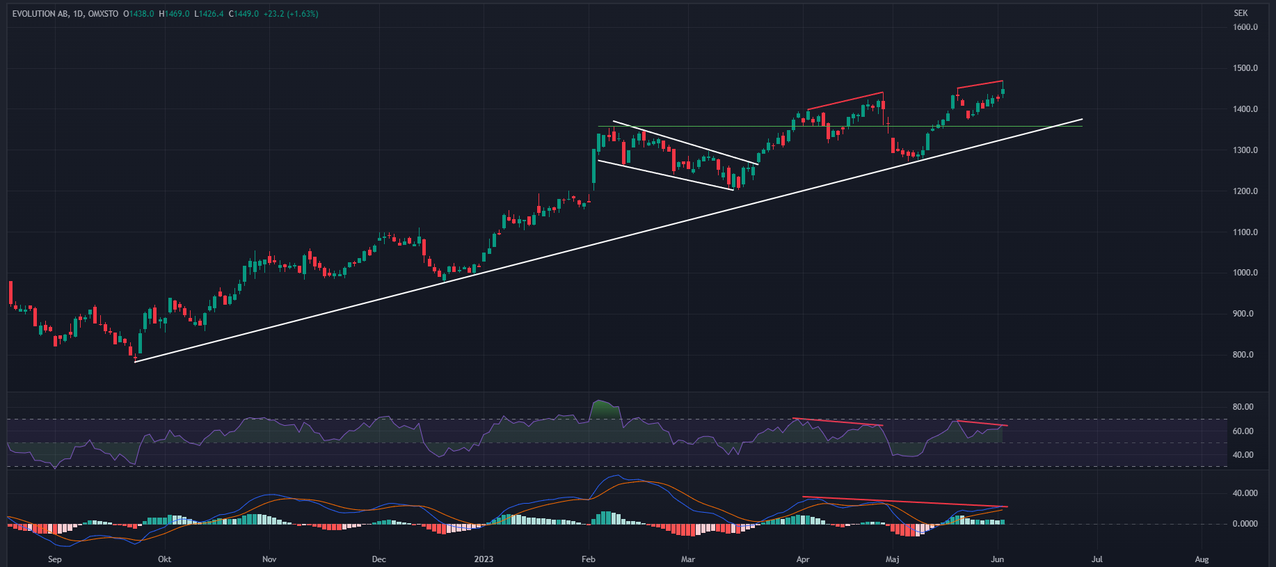 En anledning till att en rekyl står runt hörnet är att RSI och MACD har printat negativa divergenser. Vid det senaste tillfället då negativa divergenser printades i RSI så stod Evolution inför en rekyl på cirka 11 procent och köparna kom tillbaka precis vid den stigande trendkanalen. En liknande rekyl nu skulle inte jag se som något negativt utan mer som en hälsosam rekyl som på längre sikt kan få aktien att bibehålla den positiva trenden.