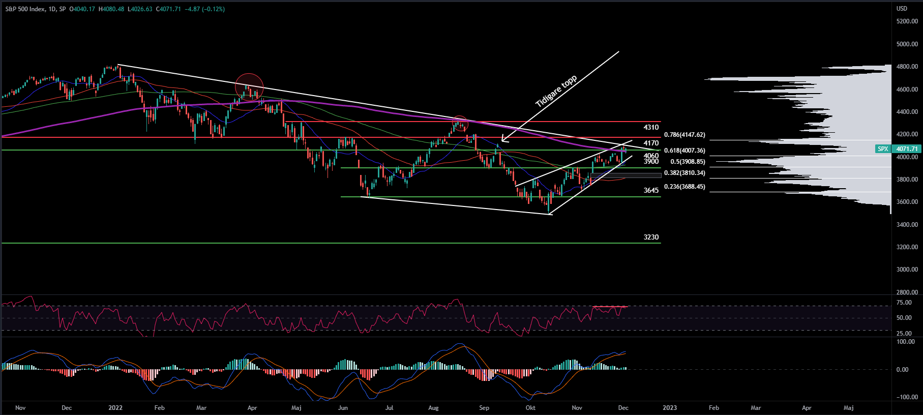 S&P 500 har under den senaste veckan tagit sig ovanför sin primärtrend och har även stängt ovanför denna prisnivå sedan onsdagens stängning. Dock verkar det som att motståndet i form av det fallande trendtaket försvaras av säljarna än så länge. När vi blickar tillbaka under 2022 kan vi se att när det fallande trendtaket har utmanats så har det skett kraftiga motreaktioner. Frågan är nu om detta är det man kan förvänta sig. Vi kan även konstatera att den senaste uppgången har format en tydlig stigande kil, en prisformation med negativ underton. Detta var något vi såg i OMXS30, den gången bröt dock priset norrut vilket ledde till ett lättnadsrally. Det kan vara värt att hålla koll på kilens golv och tak för när priset passerar någon av nivåerna så kan det leda till snabba prisrörelser.
