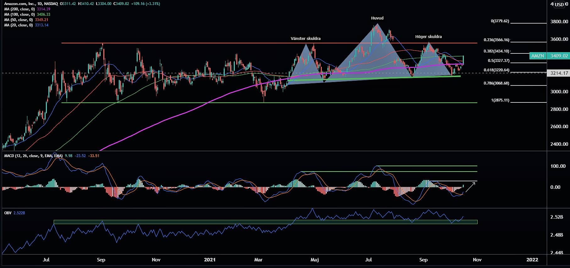 Amazon har sedan sommaren 2020 mer eller mindre handlats sidledes i en relativt stor range. MA 200 har hunnit ikapp efter att aktiekursen drog iväg under början av pandemin. Sedan ett halvår tillbaka kan vi se att den stora delen av handeln har ägt rum i den övre delen av rangen vilket med andra ord tyder på att köparna börjat acceptera ett högre pris än tidigare i rangen. Det i sin helhet ska tolkas som något positivt, däremot kan en tydlig huvud-skuldra formation utläsas i grafen vilket är mindre attraktivt. Jag ser nacklinjen som en kritisk nivå och om kursen skulle gå under nacklinjen skulle det även innebära att aktien handlas under MA 200. I ett sådant scenario skulle jag bevaka rangens trendgolv vid 2880.