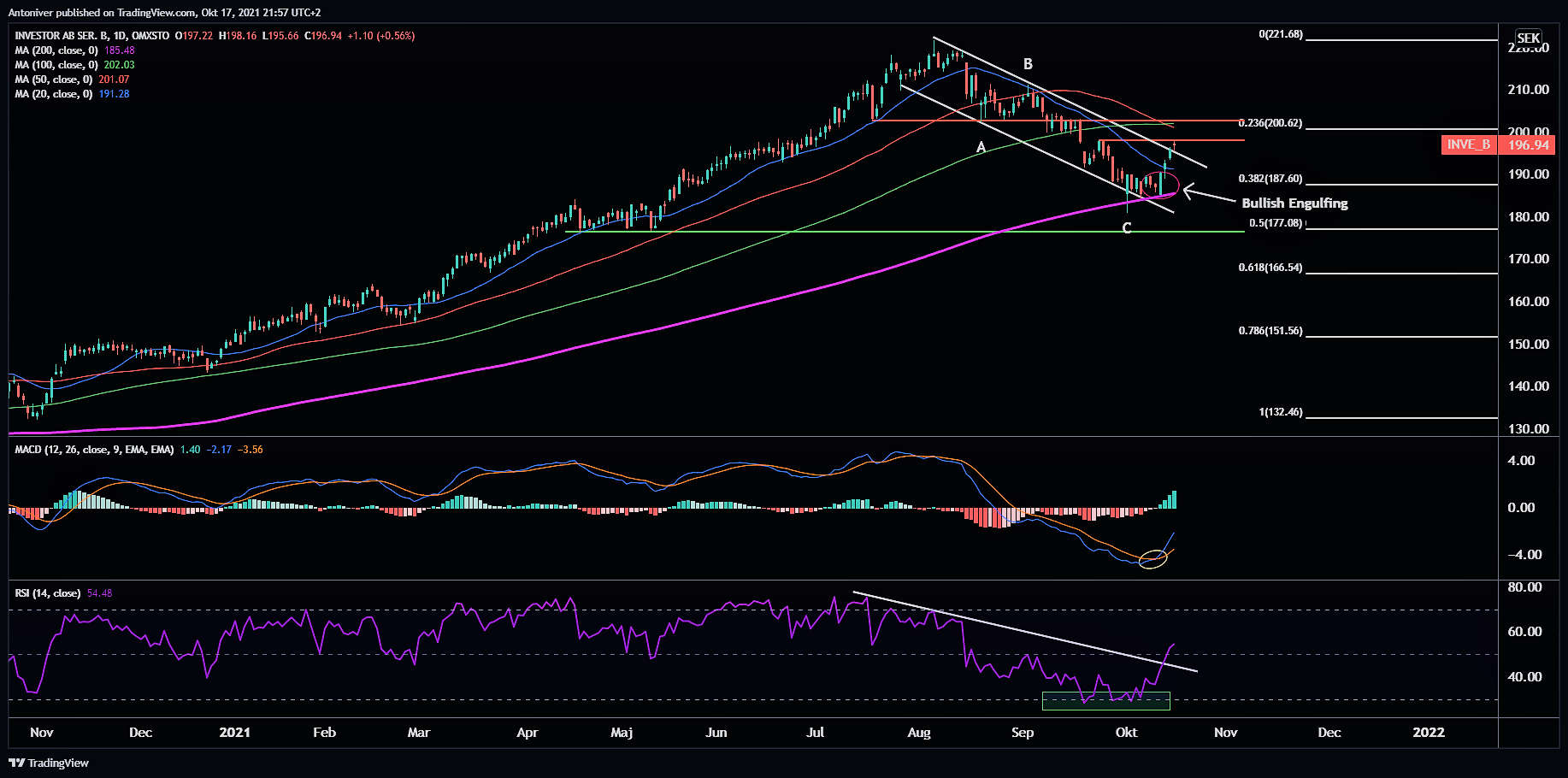 Jag ser positivt på Investor i dagsläget eftersom kursen har gjort ett utbrott genom den fallande trendkanalen på uppsidan. Det är viktigt att kursen inte faller tillbaka och genererar ett falskt utbrott. Inledningsvis den här veckan är det viktigt att bryta den horisontella motståndsnivån på 208 för att öka chansen för vidare handel ovanför den fallande trendkanalen. Vi kan se att 208 agerade som motstånd under fredagens handel och det är viktigt att motståndet tas ut för att det positiva momentumet ska fortsätta kortsiktigt. Jag ser inte 208 som ett starkt motstånd, därför är min gissning att aktien kommer att handlas upp mot det lite mer signifikanta motståndet på 203.