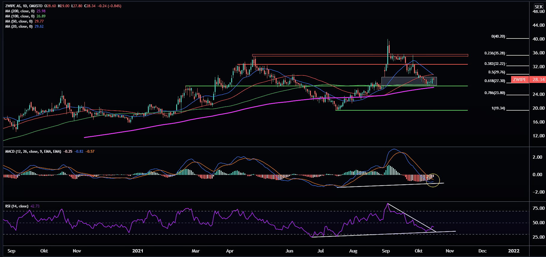 MACD håller på att skapa en högre botten än den tidigare. Gapet mellan signal- och MACD-linjen har minskat senaste två veckorna och ett positivt kors inom kort tid kan tolkas som en positiv signal vilket i sin tur kan leda till fortsatt momentum.