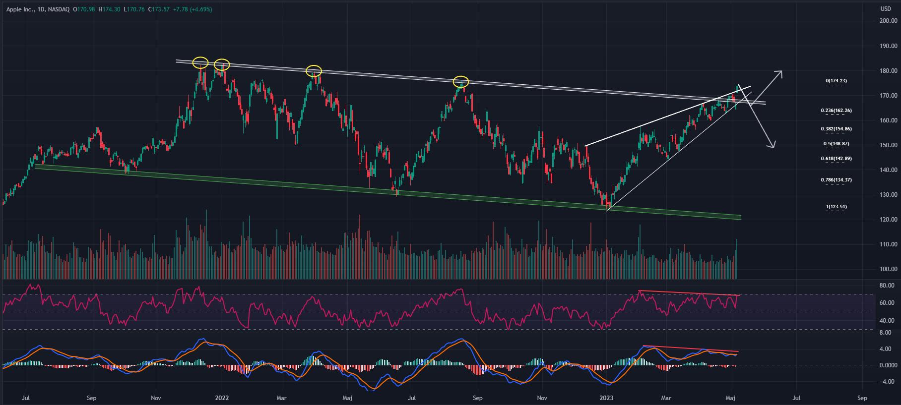 I samband med att aktien bröt ut från trendkanalen så bröt aktiekursen även norrut från den stigande kilen som aktien pendlat inom sedan årsskiftet. Allt detta är bullish men det finns även vissa varningssignaler som talar för att Apple måste ta en kortare paus innan vidare uppgång. Dels så har momenumet i uppgången avtagit något på sistone vilket läses ur RSI och MACD som printat negativa divergenser under en längre tid tillbaka. I och med fredagens öppningskurs så bildades ett gap som sträcker sig från 167 – 170,7 USD. Jag ser det som fullt möjligt att detta gap skall täppas igen inom kort vilket skulle kunna göras i samband med ett gediget återtest av utbrottsnivån.
