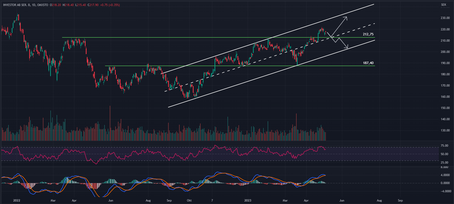Just nu handlas Investor i den övre delen av trendkanalen (ovanför mittenområdet) och om priset avancerar upp mot taket så är det vid det tillfället man ska jaga priset. Om däremot priset säger sig ner mot mittenområdet kan det vara värt att bevaka prisutvecklingen och agerar efter hur priset reagerar. Om man ser tendenserna till en studs kan en idé vara att gå lång och om priset istället bryter igenom kan man exempelvis inta en kort position med idéen om att priset ska söka sig ner mot golvet.