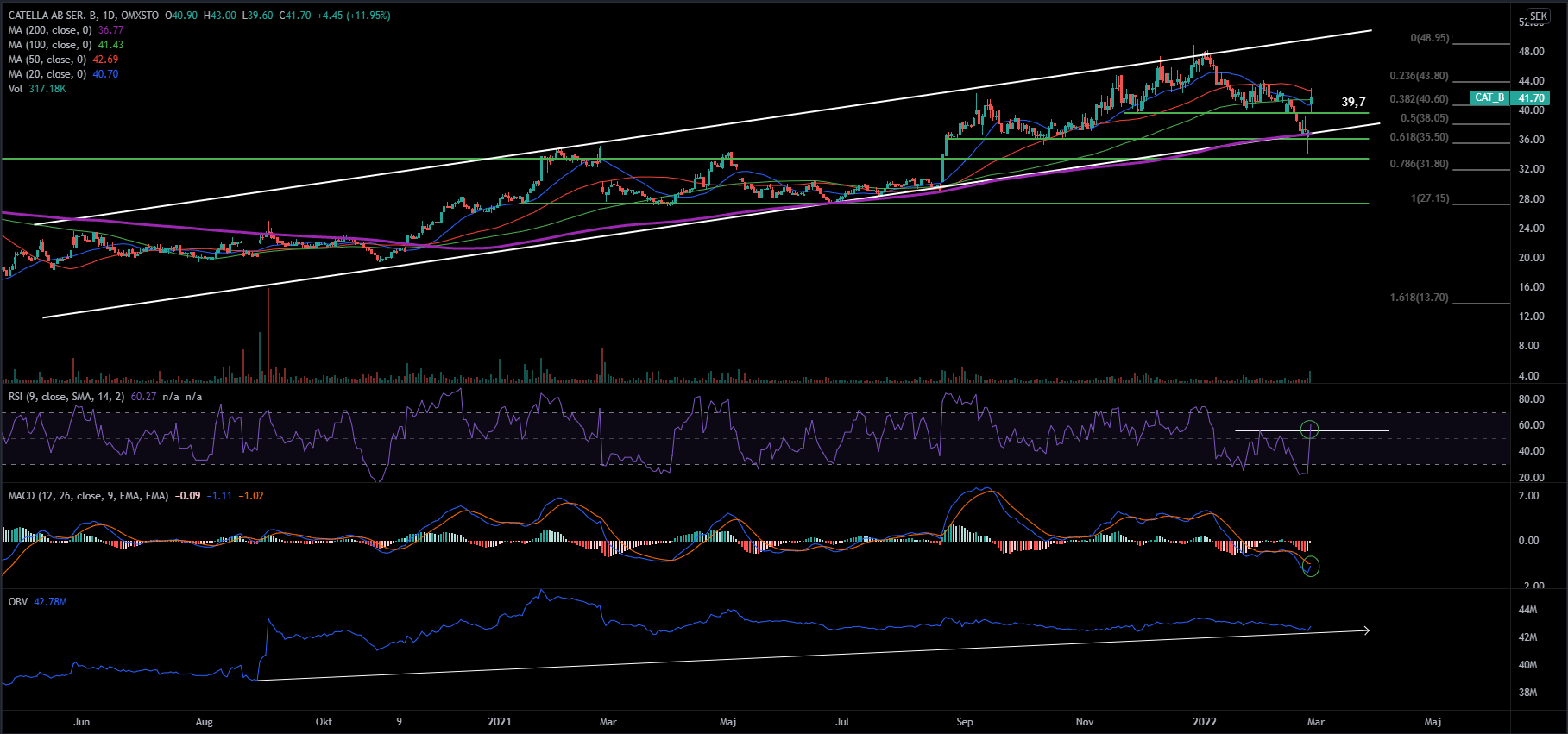 Catella släppte siffror för det fjärde kvartalet och likt Humble Group belönades aktien med en tvåsiffrig uppgång. Catella steg drygt 12 procent i fredags och lyckades därmed ta sig in och stänga i den stigande trendkanalen. Uppgången innebar även att Catella stängde över MA 200, 100 och 20 och det ser ut som att den positiva trend hålls intakt. Nu återstår frågan om det kan sättas en nya högre topp vilket skulle innebära en uppsida på cirka 20 procent.